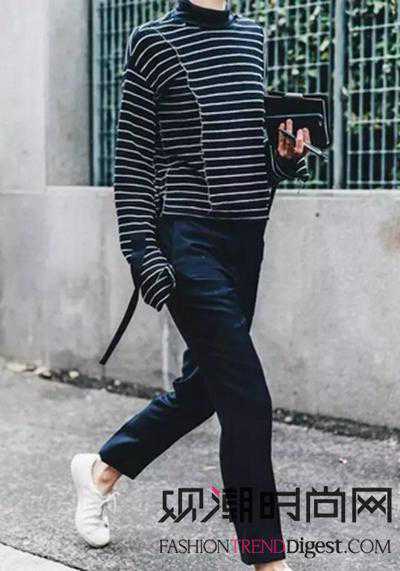 黑白条纹毛衫搭配西装裤打造帅气的中性风格。