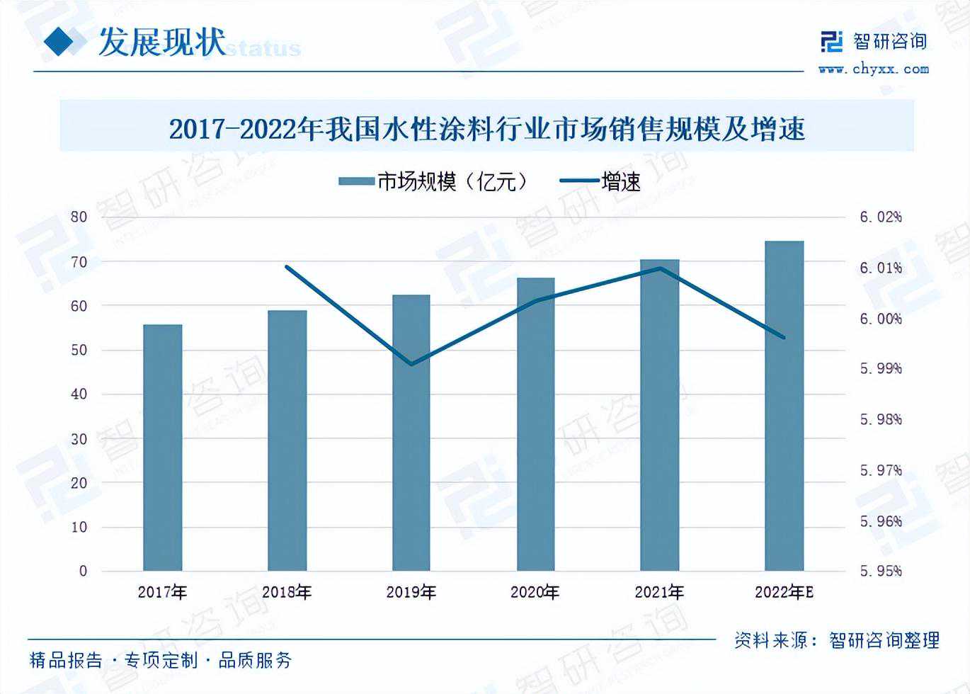 资料显示,2017-2022年,水性涂料的市场销售规模保持稳定增长,2021年我国水性涂料的市场规模同比增长6.01%,2022年同比增长约5.99%。