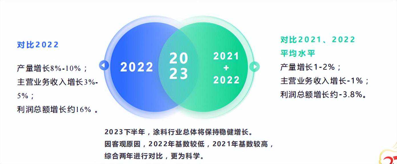10月底,中国涂料工业协会发布《我国涂料行业2023年前三季度经济运行情况分析及未来形势预判》分析指出:1-8月同比2022年,涂料市场出现缓步回升,而综合2021年进行对比,产量增长1%~2%,主营业务收入增长-1%,利润总额增长约-3.8%。