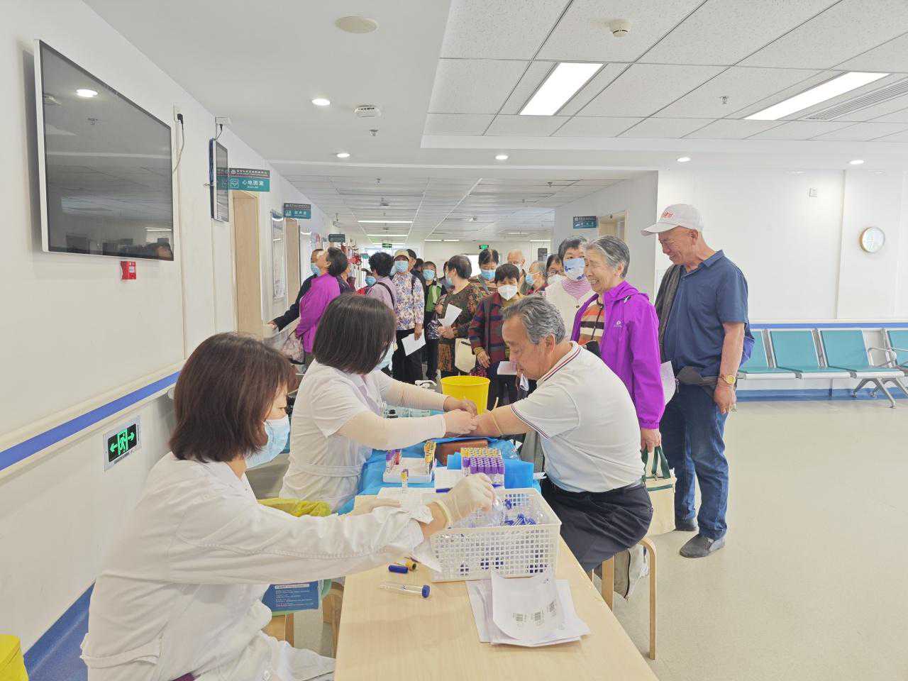 体检现场,志愿者们协助做好引导,医护人员则认真细致地为每位参加体检的老年人提供血常规、尿常规、肝肾功能、血糖血脂、一般体格检查、心电图、B超等多项检查。