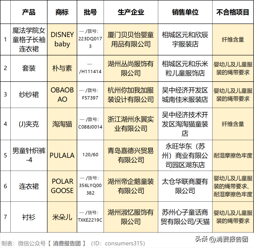 厦门贝贝怡婴童用品有限公司生产的“DISNEYbaby”长袖连衣裙、浙江湖州永翼实业有限公司生产的“淘淘猫”夹克,检出“纤维含量”不合格。