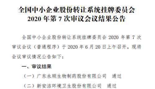 6月20日,永顺生物、新安洁两家新三板公司申请公开发行并在精选层挂牌获全国股转公司审议通过,至此新三板53家申报公开发行并在精选层挂牌获受理的企业中,已有13家企业成功“过会”,过会率达100%,其中9家公开发行事项获得了证监会核准。