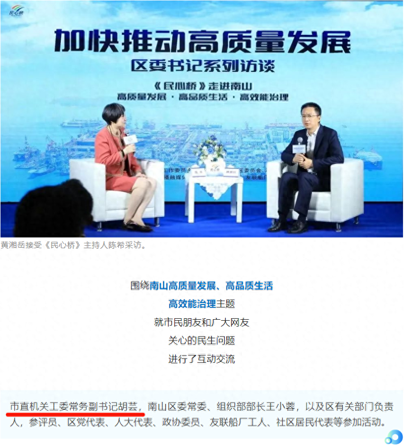 奥一新闻从创新南山官方公众号处获悉,11月21日上午,南山区委书记、区长黄湘岳做客深圳广电集团先锋898《民心桥》节目参加“加快推动高质量发展——区委书记系列访谈”。市直机关工委常务副书记胡芸,南山区委常委、组织部部长王小蓉,以及区有关部门负责人,参评员、区党代表、人大代表、政协委员、友联船厂工人、社区居民代表等参加活动。