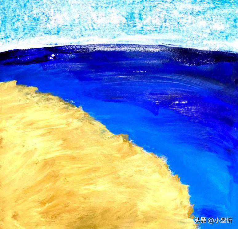 01、用蓝色水粉画出大海,注意深浅变化。用油画棒轻轻擦出天空的颜色,黄色和棕色水粉画出海滩。