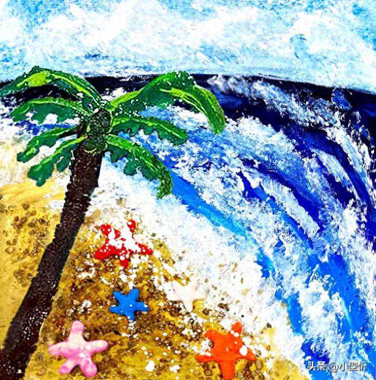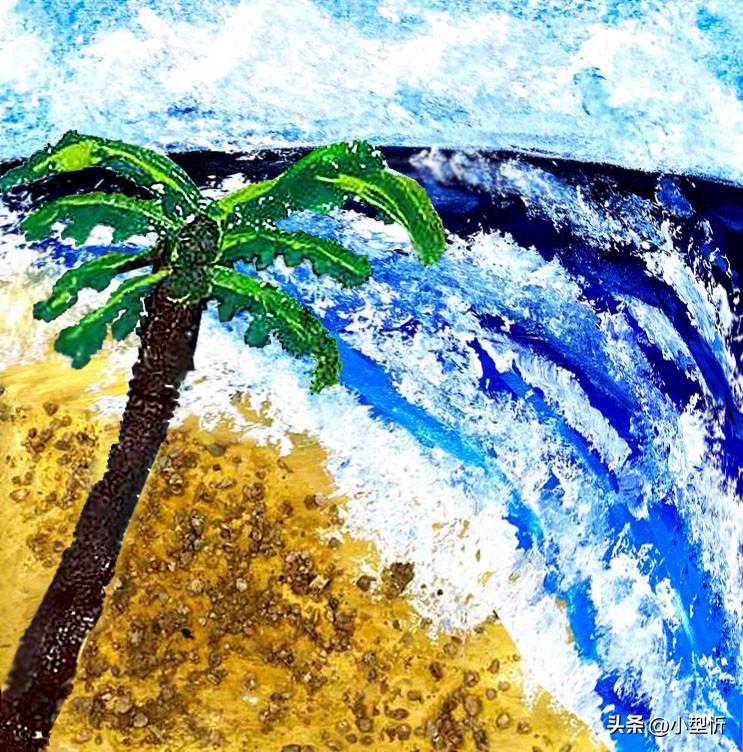 02、将报纸团成小团,蘸白色水粉排出浪花。用深棕色和绿色水粉,在沙滩边画出椰子树。
