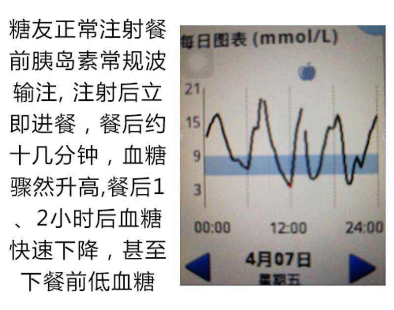 4.食物升糖与胰岛素作用不吻合,食物升糖早了,胰岛素作用晚了;食物开始升糖时,胰岛素尚未起效,所以血糖先骤然飙升;胰岛素作用高峰时,食物已消化吸收完,所以餐后1、2小时血糖骤然下降