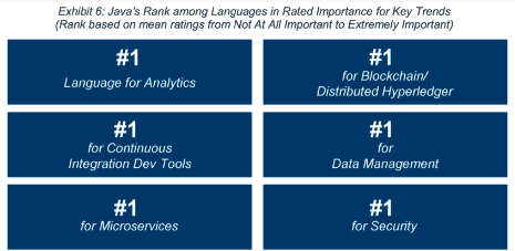 该研究报告考察了当今主流的20多种顶级编程语言,发现Java仍然是顶级技术趋势中排名第一的语言,也是开发者信任的解决安全问题的最高评级语言。
