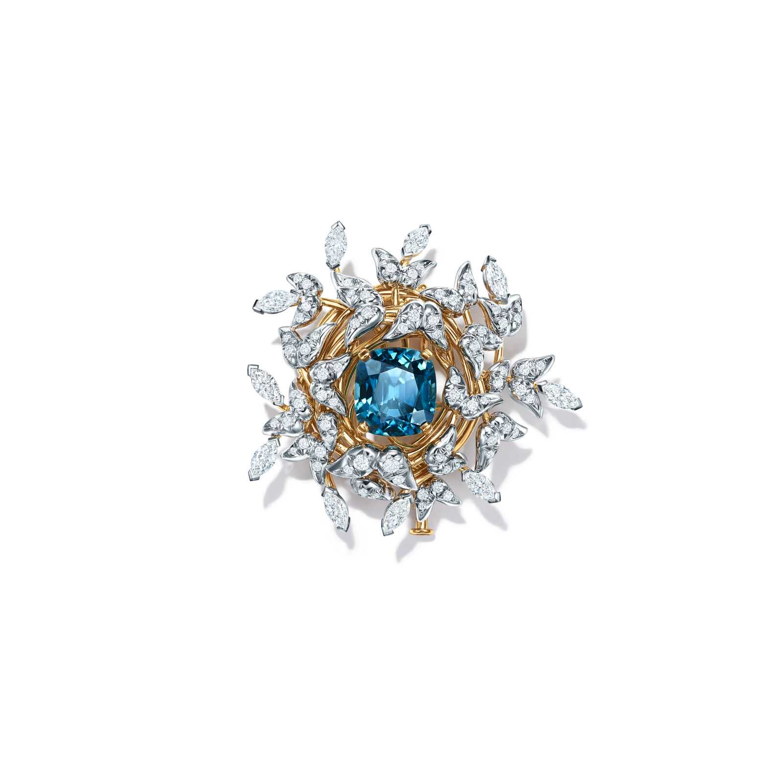 而另一枚复刻大丽花姿态的胸针则将这一系列中的华丽质感发挥到极致,由璀璨钻石与纯银互相勾勒而成的花瓣在工匠打磨下,让坚硬的材质展现出了柔软蜷曲的视觉观感。花蕊由黄金制作而成,扭曲各异的线条看起来就像是被风吹过一般。镶嵌在正中央的紫色蓝宝石为大丽花注入了深邃的神秘感,即充满力量,又让人捉摸不透。