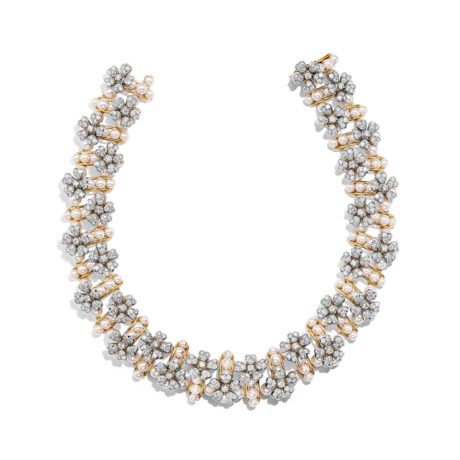 为了纪念这位对品牌影响深远的设计师,蒂芙尼近日带来了全新的Schlumberger珠宝系列,以丰沛的自然景观为灵感进行创作,构建出一个充满神秘和壮丽色彩的世界。在一条只有金色、乳白色和银色装点的FlowersandBars项链中,立体的多面雕琢钻石花卉和密集镶嵌的珍珠搭配在一起,展现出花卉翩然盛放和枝叶蜿蜒伸展的绚丽外观。