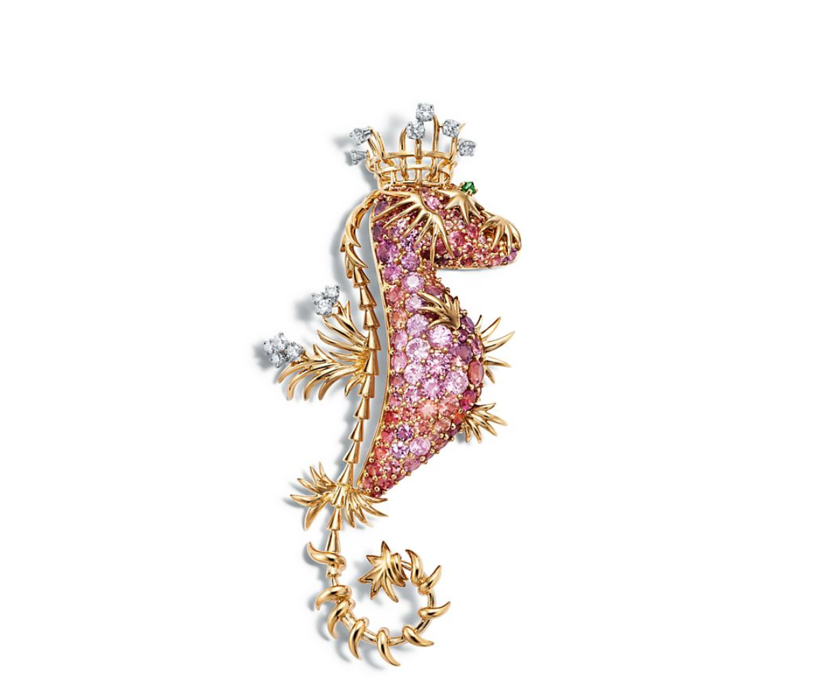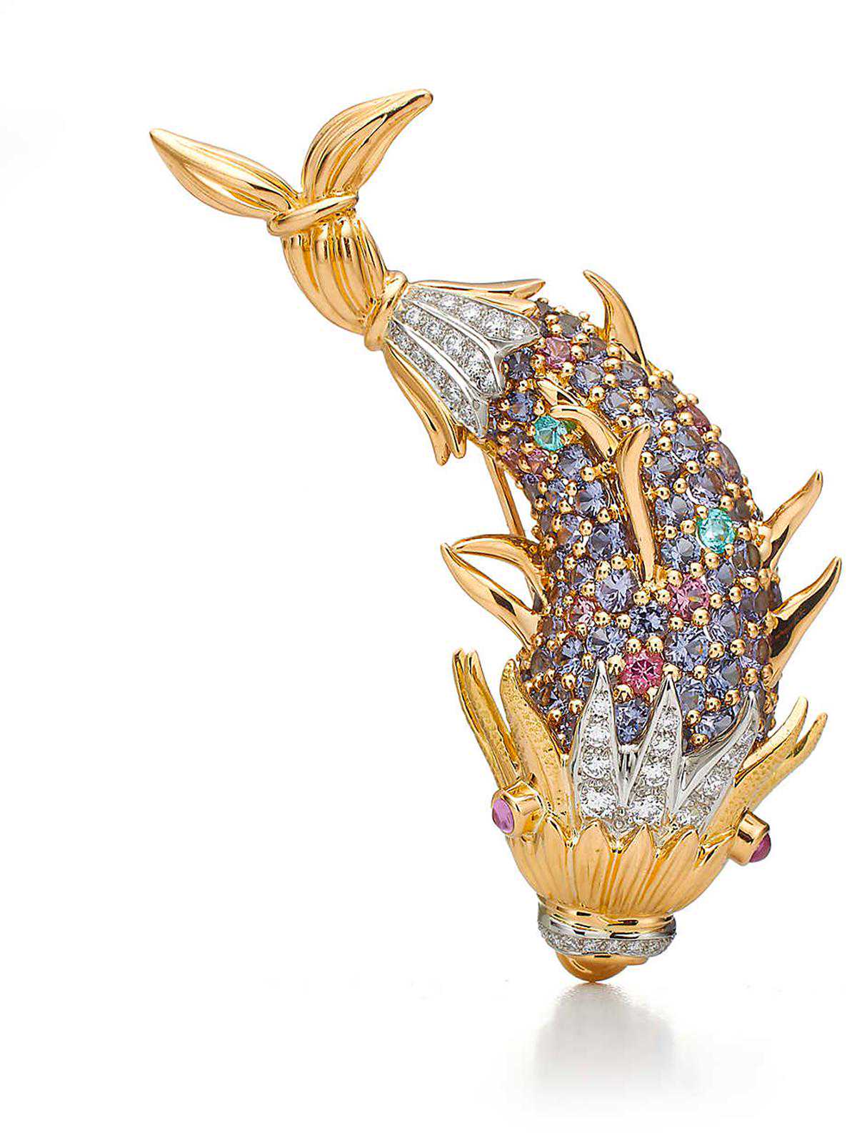 在以海洋世界为灵感而设计的两枚鱼形胸针中,蒂芙尼以18K黄金材质来制雕琢出有鱼类轻盈游动的主干躯体和漂浮触须,并用尖晶石、石榴石、沙弗莱石珍贵石材来进行点缀,折射灵动而多彩的鲜活光芒。