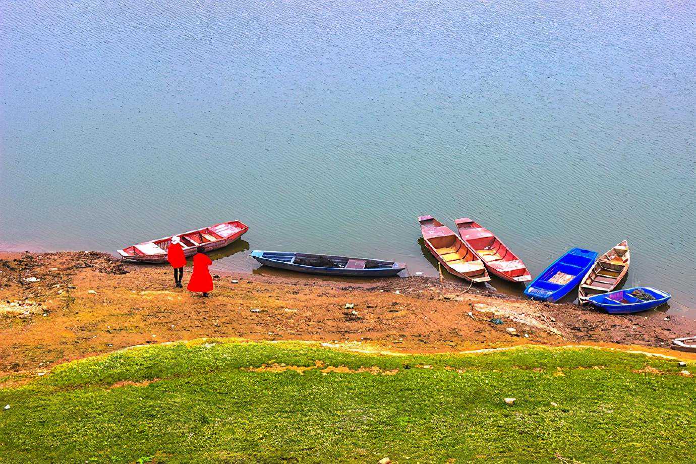 湖边一支摄影组,正在拍摄电影,湖面风景不错,湖中有渔船,湖边有茅房;旁边的山体景色也错落有致,勾勒出了这一幅“寒山湖渔村”的景象。
