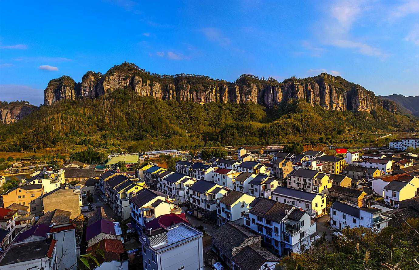 十里铁甲龙位于浙江天台山西部的后岸山村前,这里屏岩耸峙,绵亘十里,气势十分壮观。因石色铁黑,就像乌龙身上的鳞甲,故名“十里铁甲龙”。近处的一排村庄就是后岸村。