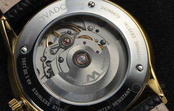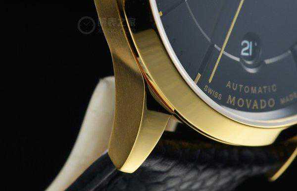 黑色的表盘上,同心圆的设计凸显出表盘的层次感,营造出强烈的视觉冲击,并配以印制的金色时标和分钟刻度,呈现出简约的设计美感。12点钟经典的金色圆点与金色的太妃时针、分针相互映衬,颇有一番趣味。6点钟的位置设有圆形的日期显示盘,为腕表更添实用功能,日期显示盘下方有非常明显的字标,分别是自动机械机芯、摩凡陀品牌和瑞士制造。