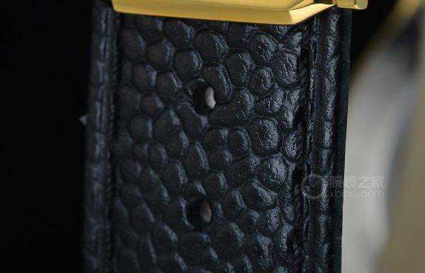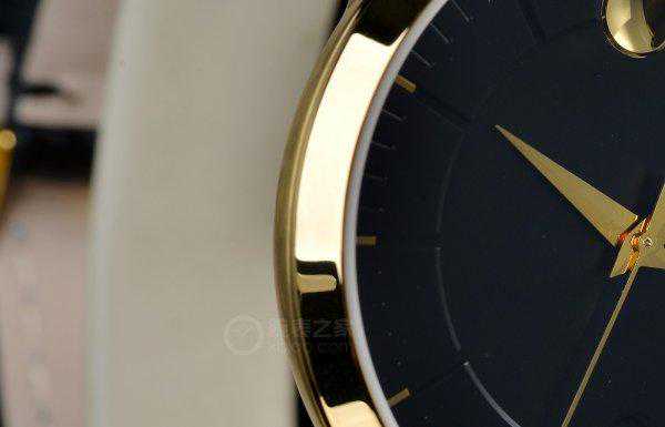这款腕表采用PVD镀金不锈钢表壳,其正面以抛光打磨而成,侧面则是采用拉丝工艺,呈现出两种不同的视觉观感。