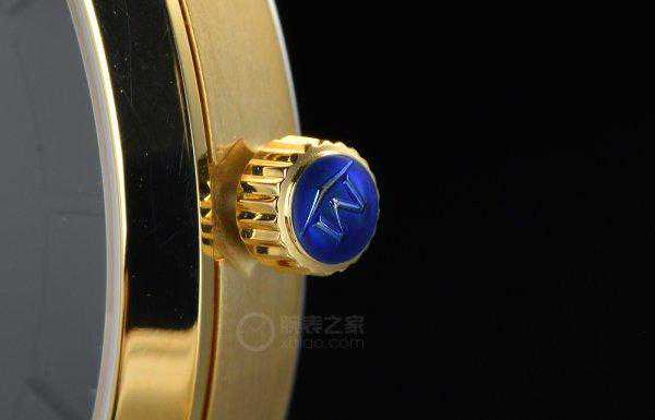 同材质的精钢表冠上镌刻品牌LOGO的“M”,同时表冠饰有坑纹,有利于方便调校时间。