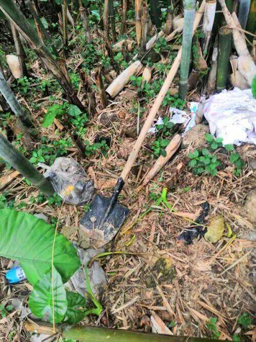 竹林被挖出一个深坑,旁边有一把铁锹、几个蛇皮袋,以及各种白色的垃圾,散发出一股刺鼻的气味。
