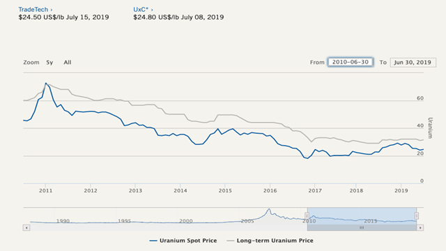 自2011年日本福岛事件以来,铀市低迷了近7年,在经历了全球减产等调整后,铀价在2018年缓慢反弹。然而由于市场对特朗普政府政策的担忧,在2019年年初时还在28美元/磅的铀目前又跌到24.5美元/磅左右。