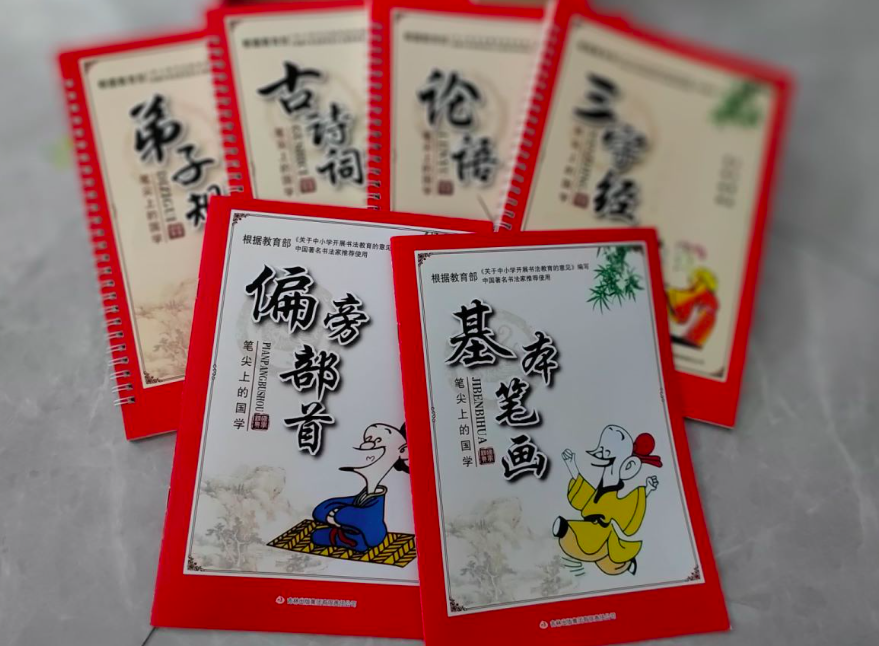 整套书包含软笔书法两册,硬笔书法四册,其中软笔书法两册主要包含基本笔画+偏旁部首;硬笔书法四册包含《三字经》《弟子规》《论语》《古诗词》四册。