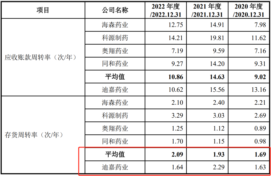招股书显示,2020-222年,其存货周转率分别为1.63、2.29、1.64,行业平均值为1.69、1.93、2.09。对此,迪嘉药业解释称,主要受需求端和供应端的双重影响,公司期末存货金额增长较大所致。