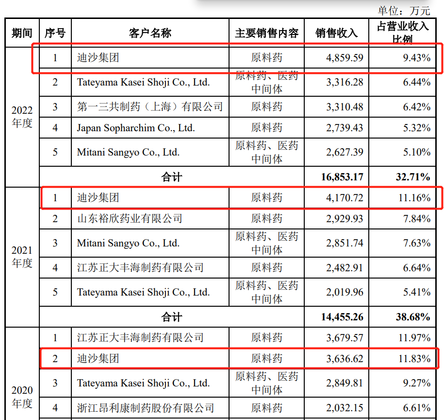 从销售端来看,迪沙集团牢牢占据迪嘉药业前两大销售客户的位置。招股书显示,2020-2022年,迪嘉药业向迪沙集团出售原料药,分别获得3636.62万元、4170.72万元、4859.59万元收入,占比总营业收入的11.83%、11.16%、9.43%。