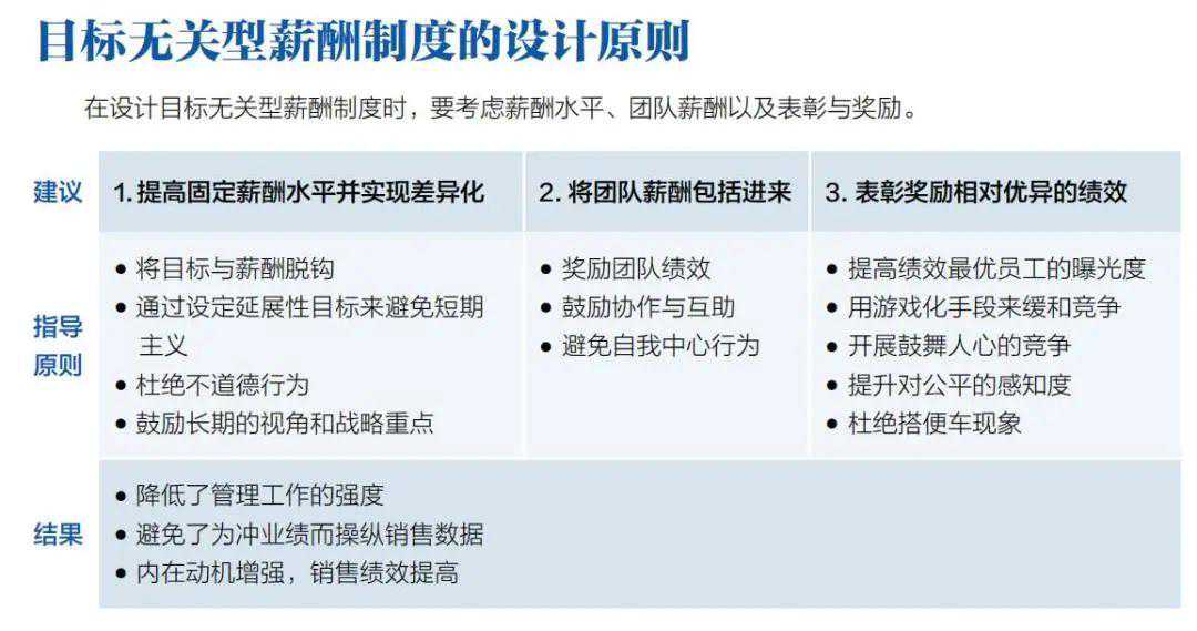 其次,目标无关型薪酬制度应包含几个基本的设计选择。确定合适的固定薪酬水平是尤为关键的选择:它需要在市场上具有竞争力,并令人信服地传达出管理层对员工的信任。