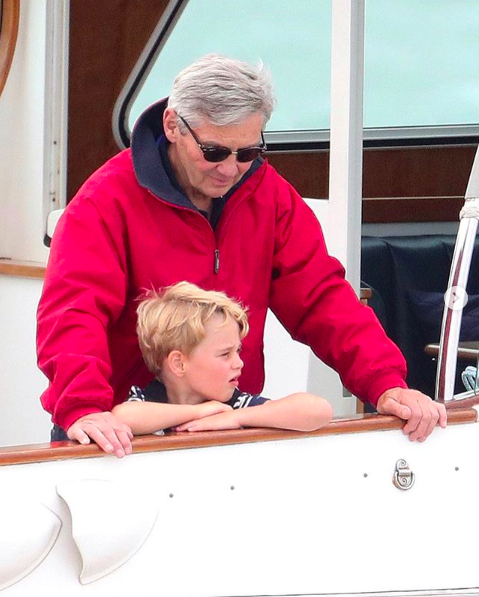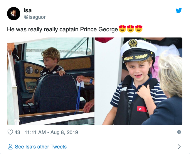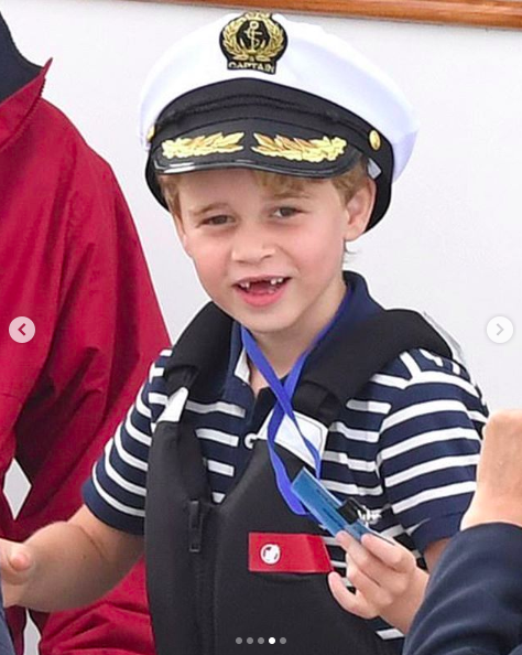 6岁的乔治王子特别喜欢驾驶舱,他穿着经典海军条纹的Breton衬衫、船长帽和救生衣,实力演绎王子的游艇着装时尚,他还戴着一个身份牌很高兴被人称为“乔治船长”,并且坐上驾驶舱,假装会开船。