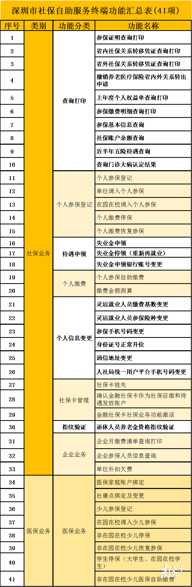 深圳市社保局介绍,为解决群众办事的“盲点、堵点、痛点”,努力打造“人民满意的服务型社保”。在社保经办机构政务服务大厅、区和街道政务服务平台、部分医院及社康中心、大型企业及工业园区、银行、大学等741个公共服务网点投放了990台社保自助服务终端。目前,实现了全市10个社保分局、24社保管理站、10个区(新区)和74个街道政务服务中心全覆盖,方便广大市民就近自助查询和办理社保业务,打通社保服务的“最后一公里”。