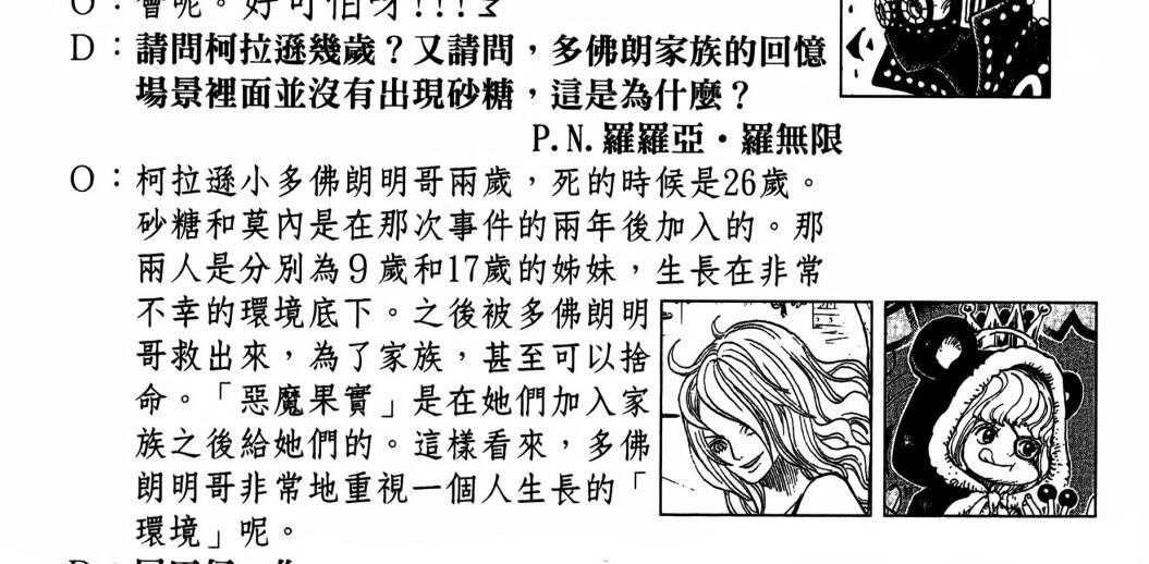 砂糖和莫奈是姐妹这事可能很多人都不知道,因为尾田并没有在正片里面谈到,而是在SBS中补充的。在堂吉诃德家族的回忆那里,砂糖和莫奈这两个老干部都没有出现,这因为她们是在柯拉松死后的两年才加入的。当时砂糖只有9岁,莫奈17岁,两个人生活在非常不幸的环境下,明哥很注重孩子的生长环境,将她们救出来带回了家族,后来还给了她们恶魔果实,所以这两人都能够为了明哥舍命。