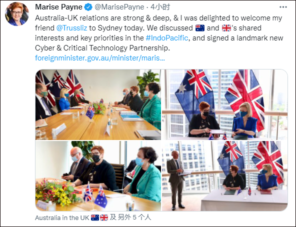 英国外相特拉斯则表示:“英国和澳大利亚是天然的合作伙伴,我们决心通过融资和提供可靠、诚实的清洁基础设施来发挥积极主动的作用。英国致力于建立‘自由网络’,这意味着通过支持印太地区国家解决其发展需求来捍卫民主。”