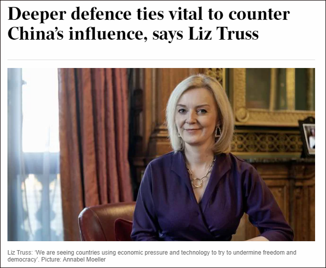 19日,特拉斯接受澳媒专访时更加不加掩饰,将矛头直指中国。她声称,当今世界的“侵略性正在增加”,其中,中国对立陶宛和澳大利亚的“经济胁迫”行为有所增加。特拉斯宣称,建立更深层次的防务关系对于对抗中国的影响力至关重要,英国正就此发出自己的声音。