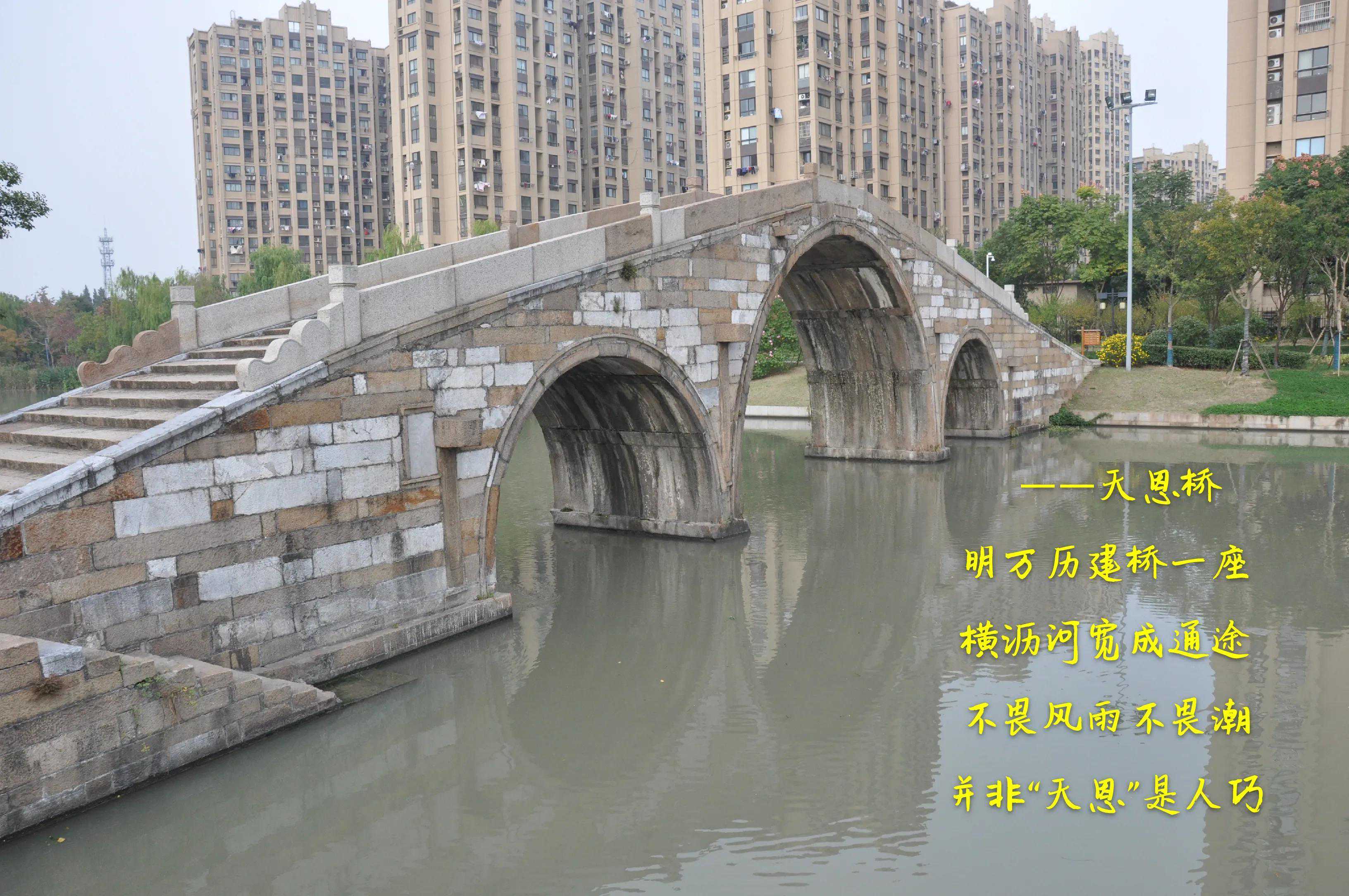 天恩桥,原称真圣堂桥,位于镇北永丰村。跨横沥,建于明朝,几经毁建,是嘉定境内最长最高的三孔石拱桥。