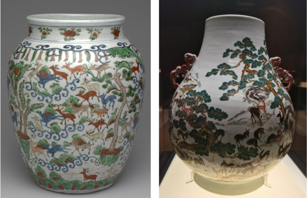 西周之际,随着封建礼制的建立,鹿成为政通人和、天下太平的象征。周文王在灵台之下兴建了灵囿和灵沼,据《诗经·大雅·灵台》载,“王在灵囿,麀(yōu,母鹿)鹿攸伏。麀鹿濯濯(毛诗正义释曰,娱游也),白鸟翯翯”,《毛诗正义·卷十六》载,“文王既立灵台,而知民心归附,作沼囿,而知鸟兽得所”,也就是灵台作为天人感应的场所,象征民心所向;灵囿中鹿和白鹭自由自在地生活,象征整个社会的安宁。《诗经·小雅·鹿鸣》中所歌颂的“呦呦鹿鸣,食野之苹”的景象背后,是周礼教化下的天下大治:“我有嘉宾,鼓瑟吹笙……人之好我,示我周行”,四方诸侯宾客都心悦诚服地按周礼来拜会周天子(图4)。《庄子·内篇·天地篇》云“至德之世,不尚贤,不使能,上如标枝,民如野鹿”,庄子所认为的理想社会就是百姓如野鹿般自由自在地生活,这与“呦呦鹿鸣”的意象是一致的。在一千多年后的明清两代,“呦呦鹿鸣,食野之苹”的形象出现在了官窑所烧造的瓷器上,《格致镜原·卷三十六》中记载了明代万历年间烧制的“五彩百鹿永保乾坤坛”,清代乾隆、道光年间亦有烧制百鹿尊(图5)。