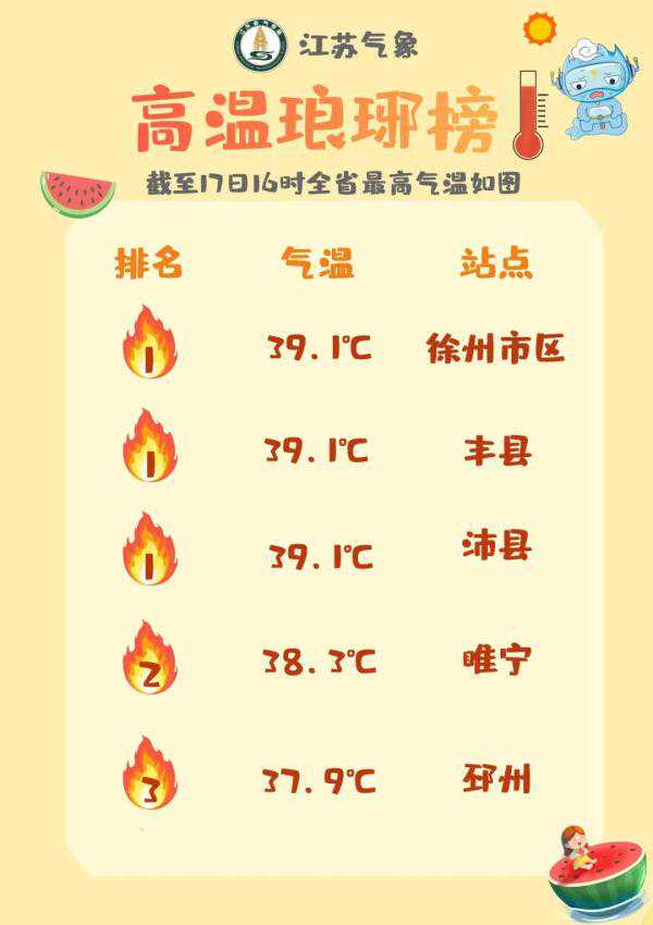 高温•最高39.1℃新一轮高温“竞赛”今天继续一起来看一下你“上榜”了吗?今天气温再创新高西北部徐州市区、丰县、沛县气温突破39℃!沿江及以北地区基本也都在35℃以上高温•持续2022年06月17日1......