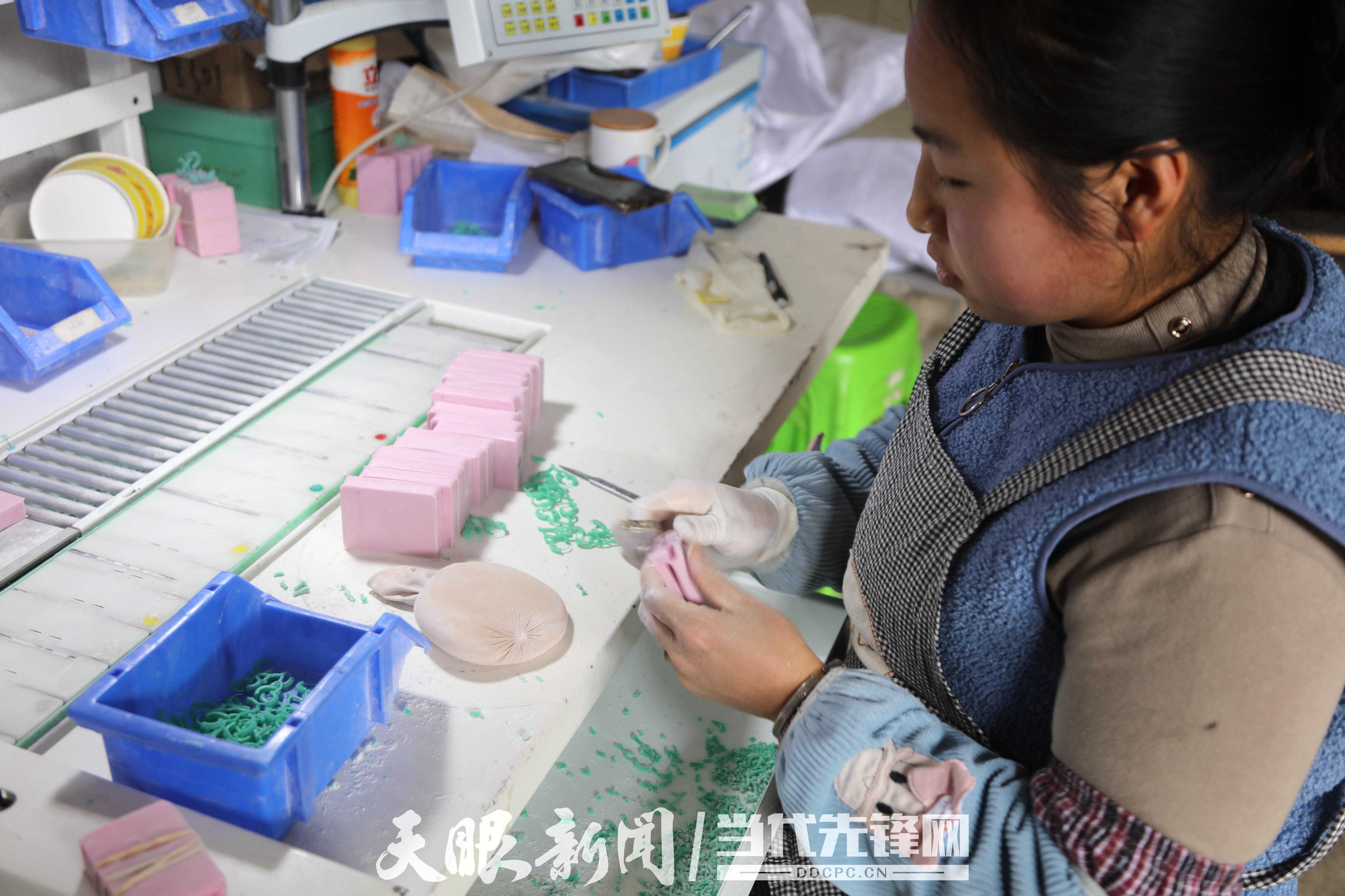 加工厂里,村民夏敏熟练开展手上工作。“我家来这里就几分钟路程,不仅能照顾孩子,一个月还能挣三千块钱左右,做这个也不需要有什么专业技能,很简单。”夏敏乐呵地说。