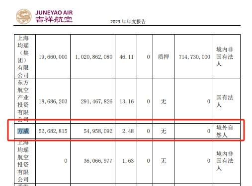 此前,吉祥航空在发布财报时,将方威的身份写成了“境外自然人”。公告显示,截至报告期末前十名股东中,方威以5495.81万股,位列第三。方威也是吉祥航空前十大股东中唯一一名自然人股东。