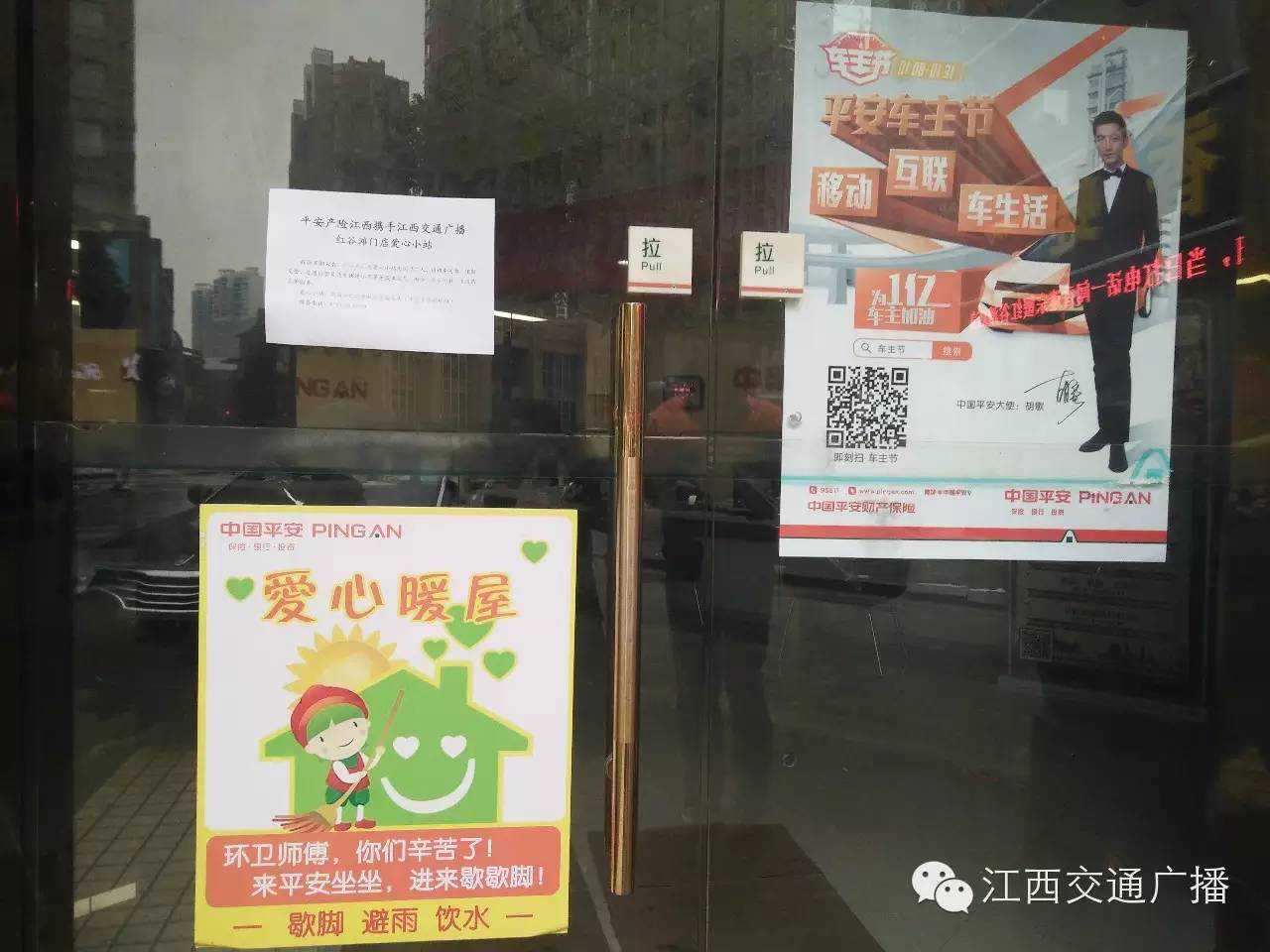 这个时候,让我们想起了路面上工作的环卫工人、出租车司机、值勤交警、交通协管员还有快递小哥。江西交通广播昨日发出《城市爱心小站》的倡议,倡议我们的各种店面,包括银行、餐饮、药店以及其它各类公司的门店,希望尽你所能打开店门,让我们的户外劳动者走进你家的店门,一杯热水、一个空调下的座椅,让他们能暂时休息,感受温暖。