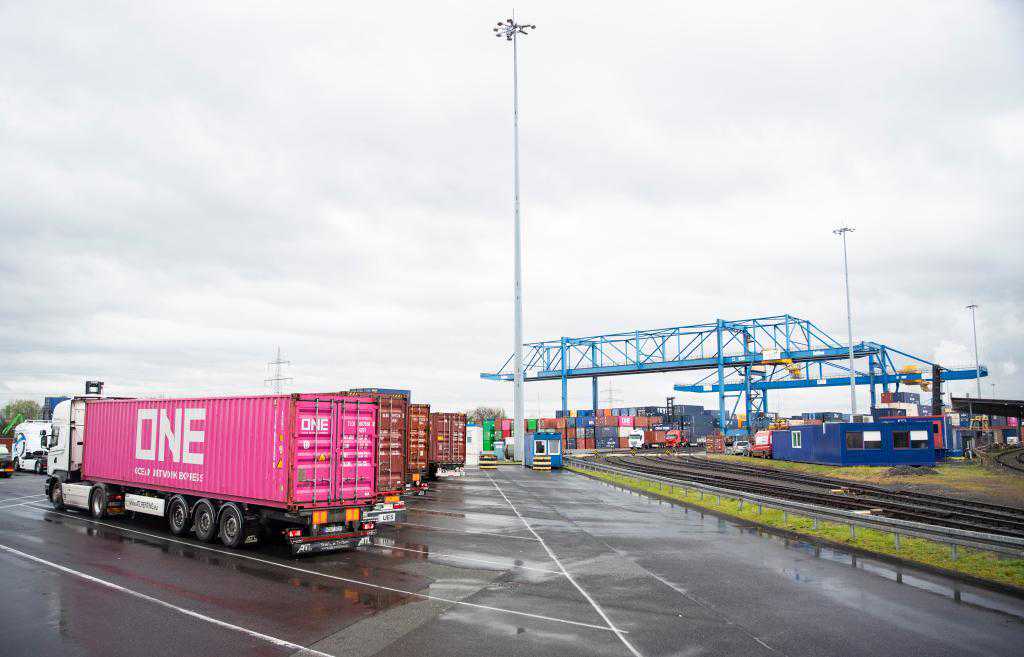 位于莱茵河西岸的杜伊斯堡港DIT货运场站,是中欧班列的主要操作场站。目前,每周约有60列中欧班列抵达这里。数台几十米高的起重机和各类装卸设备紧密配合作业,将卸下的集装箱码放整齐,形成一座座连绵不绝的“小山”。随后,这些跋涉万里、种类丰富的中国货品通过水路、铁路或公路运输,送往周边城市和其他欧洲国家。
