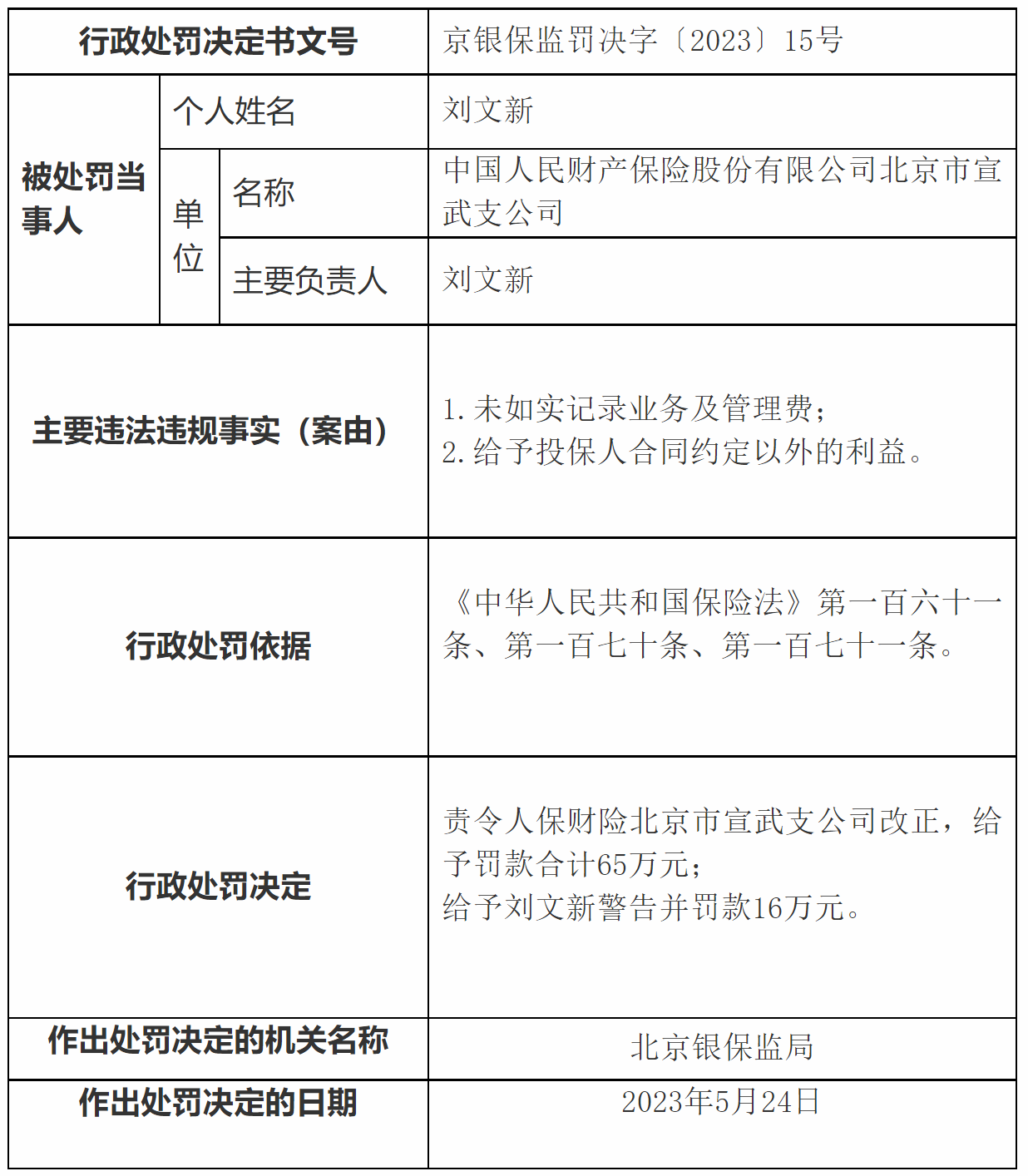 央广网北京6月2日消息(记者冯方)近日,人保财险北京市宣武支公司受到北京银保监局行政处罚,因未如实记录业务及管理费、给予投保人合同约定以外的利益两项违法违规行为,该支公司被责令改正,并被罚款合计65万元。该支公司主要负责人刘文新被警告并被罚款16万元。