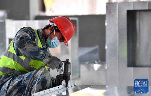 5月1日,在位于江苏省海安市的江苏五水环境工程有限公司内,工人在赶制供应方舱医院的污水处理设备订单。新华社发(翟慧勇摄)