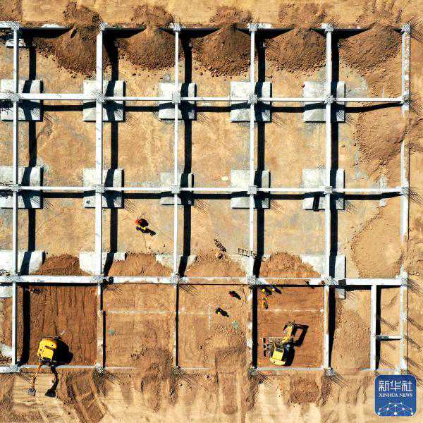 5月1日,工人在河北省石家庄市栾城区万吨豆粉生产基地项目工地施工(无人机照片)。新华社发(李明发摄)