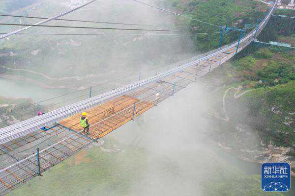 5月1日,工作人员在由中铁广州局承建的贵州金(金沙)仁(仁怀)桐(桐梓)高速桐梓河特大桥建设现场行走(无人机照片)。新华社记者刘续摄