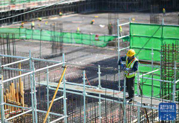 5月1日,中建八局四公司的工人在山东省青岛市即墨区陆港临空云创中心项目现场作业。新华社发(梁孝鹏摄)