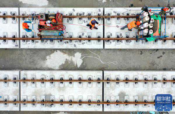 5月1日,工人在浙江省温州市温州轨道交通S2线乐清段作业(无人机照片)。新华社发(蔡宽元摄)