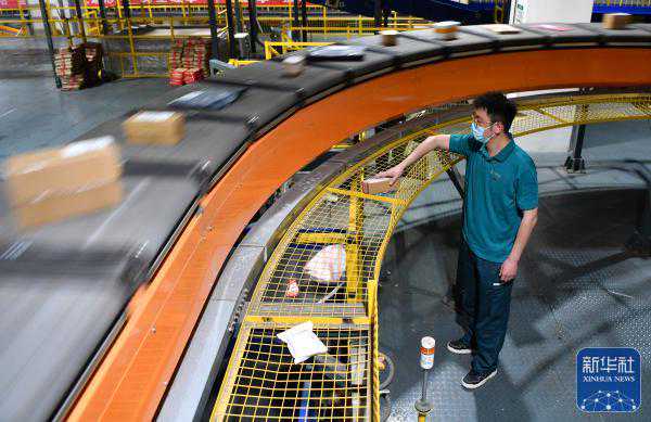 5月1日,在中国邮政速递物流郑州邮件处理中心,工作人员在拾取飘落邮件包裹。新华社记者李嘉南摄