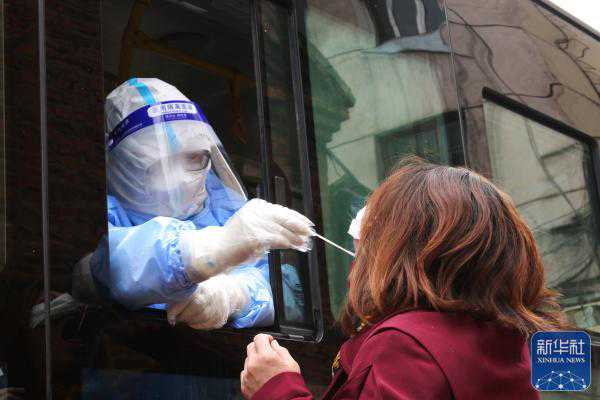 5月1日,在黑龙江省牡丹江市爱民区一处核酸采样点,工作人员为居民做核酸检测采样。新华社发(张春祥摄)