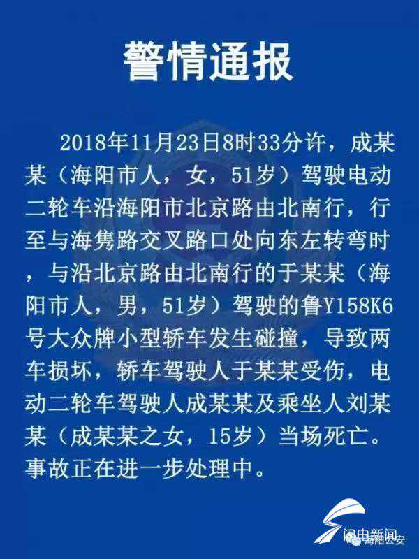齐鲁网11月232018年11月23日8时33分许,成某某(海阳市人,女,51岁)驾驶电动二轮车沿海阳市北京路由北南行,行至于海隽路交叉路库处向东左转弯时,于沿北京路由北南行的于某某(海阳市人,男,51岁)驾驶的鲁Y158K6号大众牌小型轿车发生碰撞,导致两车损坏,轿车驾驶人于某某受伤,电动二轮车驾驶人成某某及乘坐人刘某某(成某某之女,15岁)当场死亡。事故正在进一步处理中。