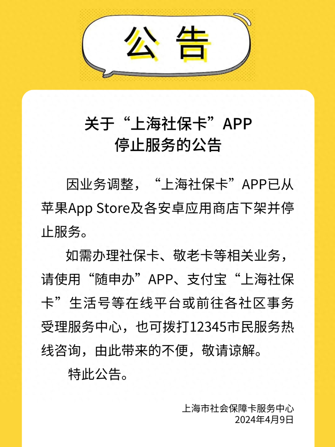 市大数据中心介绍,因业务调整,“上海社保卡”APP已下架并停止服务。市民如需办理社保卡、敬老卡等相关业务,请使用“随申办”APP、支付宝“上海社保卡”生活号等在线平台或前往各社区事务受理服务中心,也可拨打12345市民服务热线咨询。详见↓