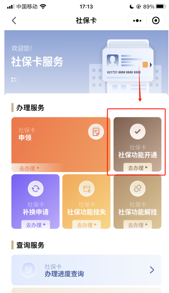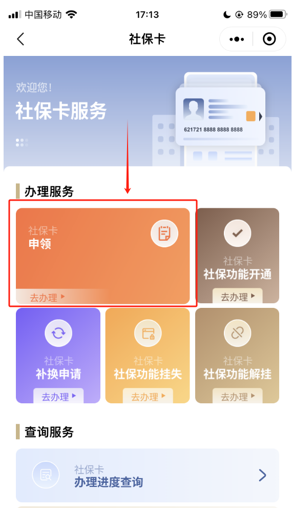 1、在“社保卡服务”页面的“查询服务”栏下,选择“办理进度查询”即可一键查询办件进度。