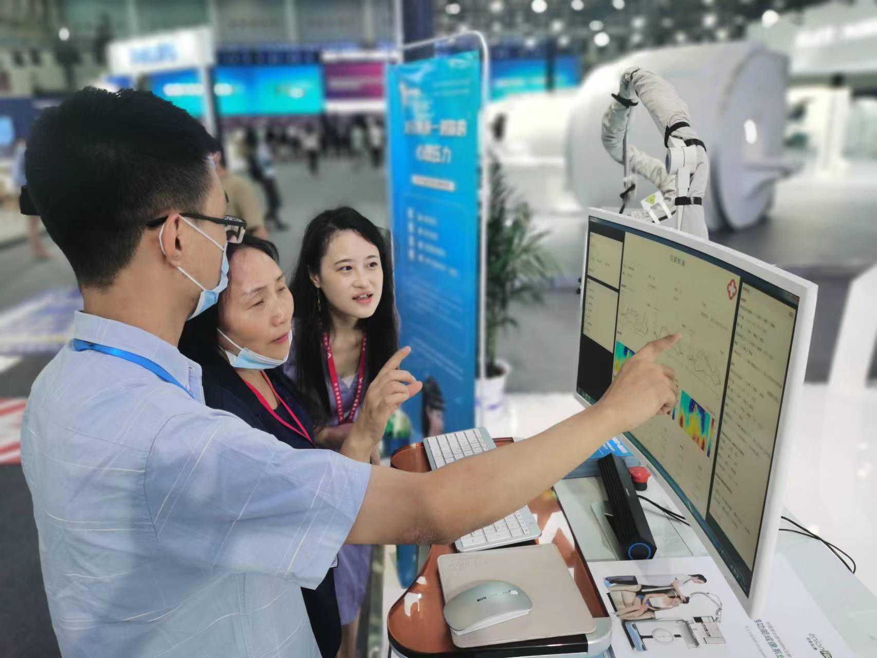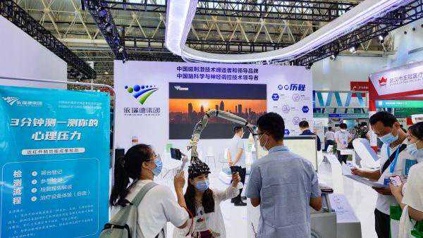 展台工作人员介绍,近红外脑功能成像系统(fNIRS)是一种新型的无创神经影像技术。其原理是利用特定波长的近红外光穿透颅骨,探测大脑皮层血液中的主要成分(氧合血红蛋白和脱氧血红蛋白)的浓度变化,从而实现检测和判断大脑活动状态的目的。与脑电图(EEG)相比,fNIRS具有更高的空间分辨和更好的抗噪声性能,可以在任何时间、任何地点进行长时间不间断测量。fNIRS技术被越来越多地应用于神经性疾病的监测、预防、诊断与治疗效果评估、疾病治疗和康复等方面。