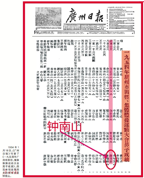 1954年1月18日,《》第二版刊登了一则消息,标题是《一九五四年广州市田径、集体体操运动大会男子成绩》。在男子400米成绩单里,第四名的获得者是一个名叫钟南山的小伙子。